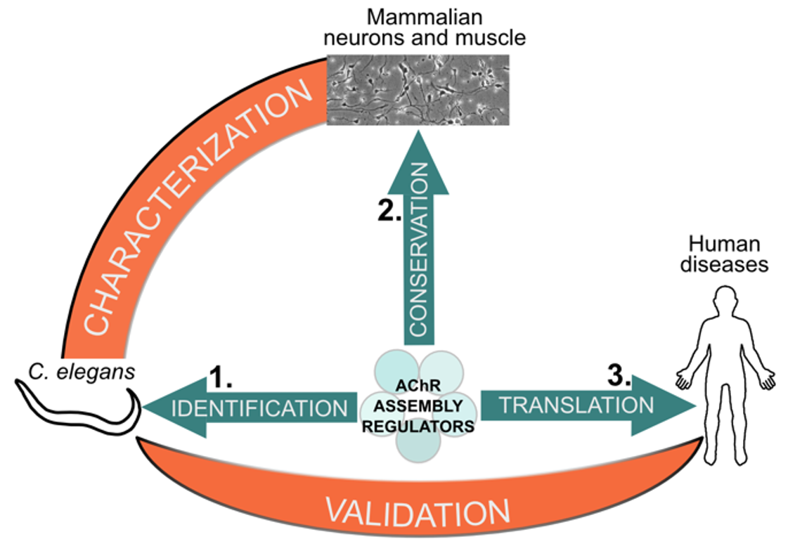 Because AChRs have been extremely conserved during evolution, we will address this question first using the nematode C. elegans as a genetically tractable system, and then in human cells. We will also use the C. elegans model to rapidly validate novel variants in genes controlling AChR assembly from undiagnosed patients and assess their severity.