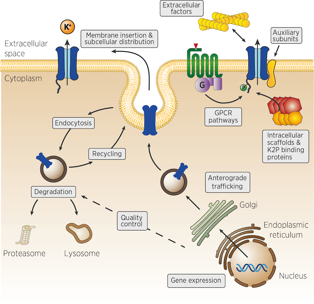 Many different mechanisms could control the number, the activity and the localisation of K2P channels in vivo. From the control of channel expression, biosynthesis and trafficking, to the regulation of membrane insertion, recycling and channel activity at the cell surface (figure). Very few experimental strategies can identify, at once, genes acting in such diverse aspects of cellular physiology. We propose that genetic strategies could address many of these levels of regulation.
